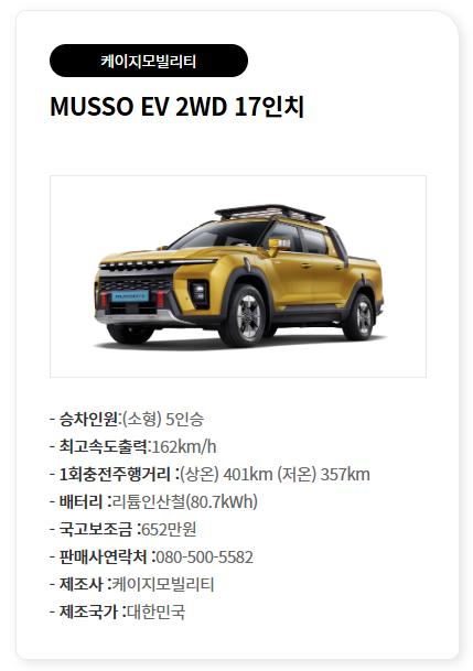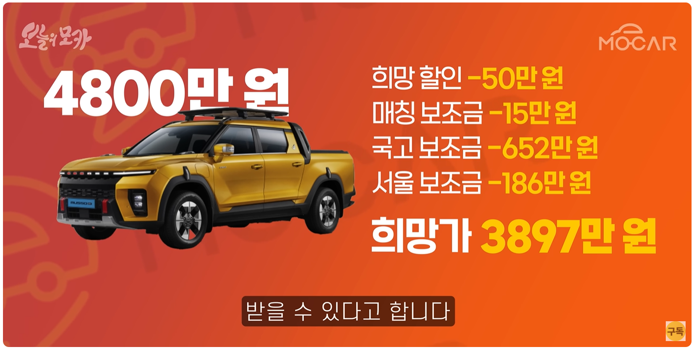 KGM의 무쏘 EV는 전기 화물차로 분류되어, 기본 보조금이 매우 높습니다.