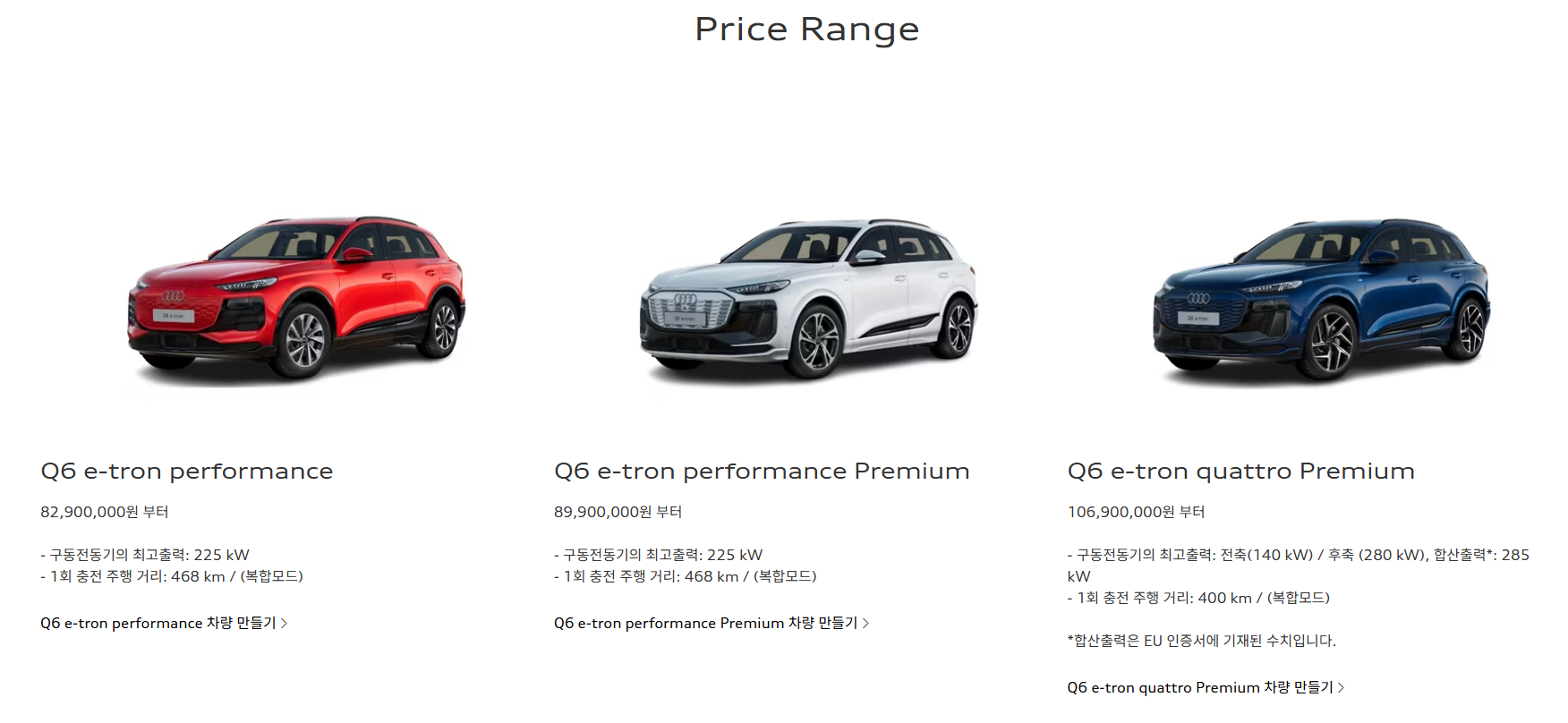 Q6 이트론은 기본 모델 기준 8,200만 원대, 프리미엄 모델은 8,900만 원대부터 시작합니다.