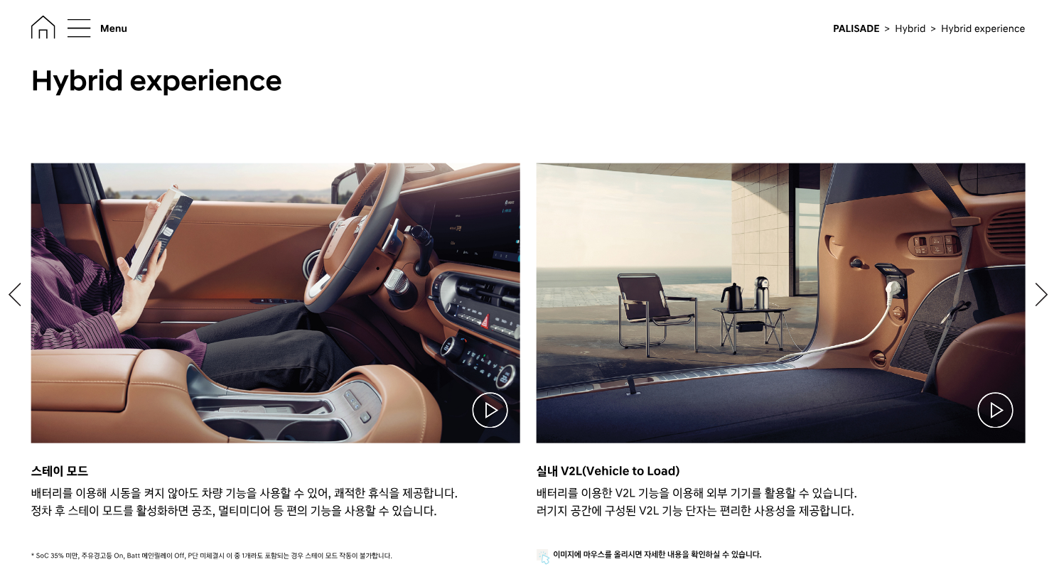 현대 팰리세이드는 하이브리드가 되면서 V2L(차량 외부 전력공급) 기능을 활용할 수 있게 되었고, 스테이 모드를 통해 캠핑 시 전기 사용도 가능한 모델이 되었습니다.