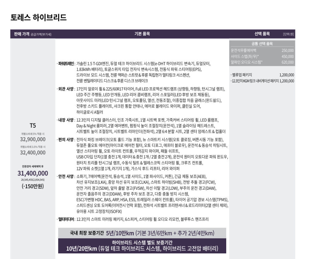 ✔ T5 풀옵션 및 전체 커스터마이징 옵션 선택 기준 약 4,050만 원 내외로 투싼, 스포티지 하이브리드보다 100~200만원 더 저렴